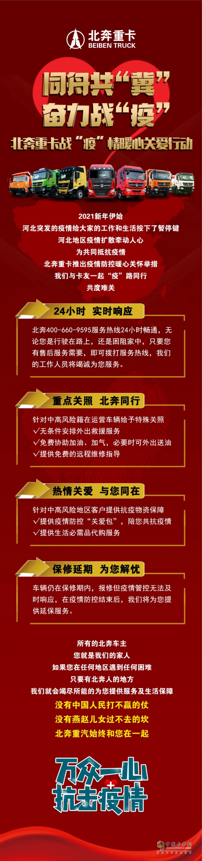 2021新年伊始,河北突发的疫情给大家的工作和生活按下了暂停键,河北地区疫情扩散牵动人心,为共同抵抗疫情,北奔重卡推出疫情防控暖心关怀举措。我们与卡友一起“疫”路同行,共度难关。
